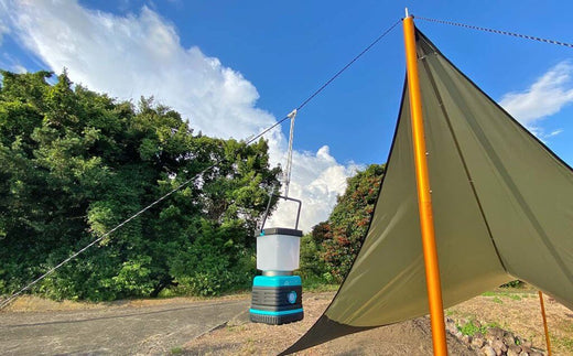 ガイロープにランタンを掛けたいときに、輪っか状のロープを使ってガイロープにプルージック結びをするとランタンが掛けられます。結び目を簡単に移動できるので、程よい位置にランタンを設置できます。